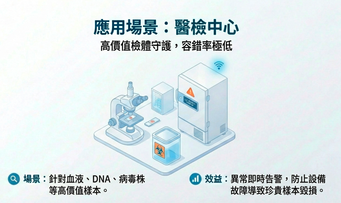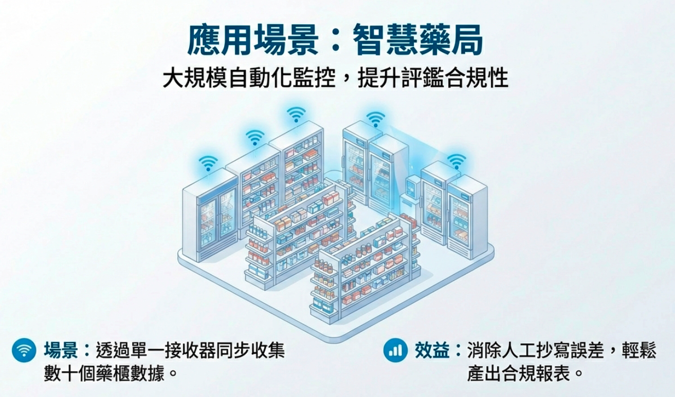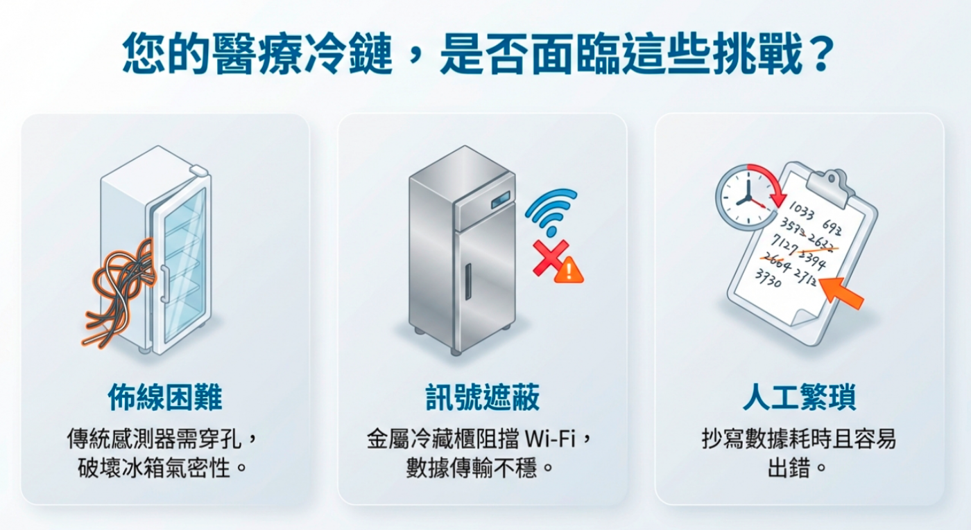 在醫院的護理站、藥局及醫檢單位,每一支疫苗與每一份檢體都價值連城。傳統的監測方式常面臨「穿孔佈線困難」或「Wi-Fi 訊號易受金屬冰箱遮蔽」的挑戰。