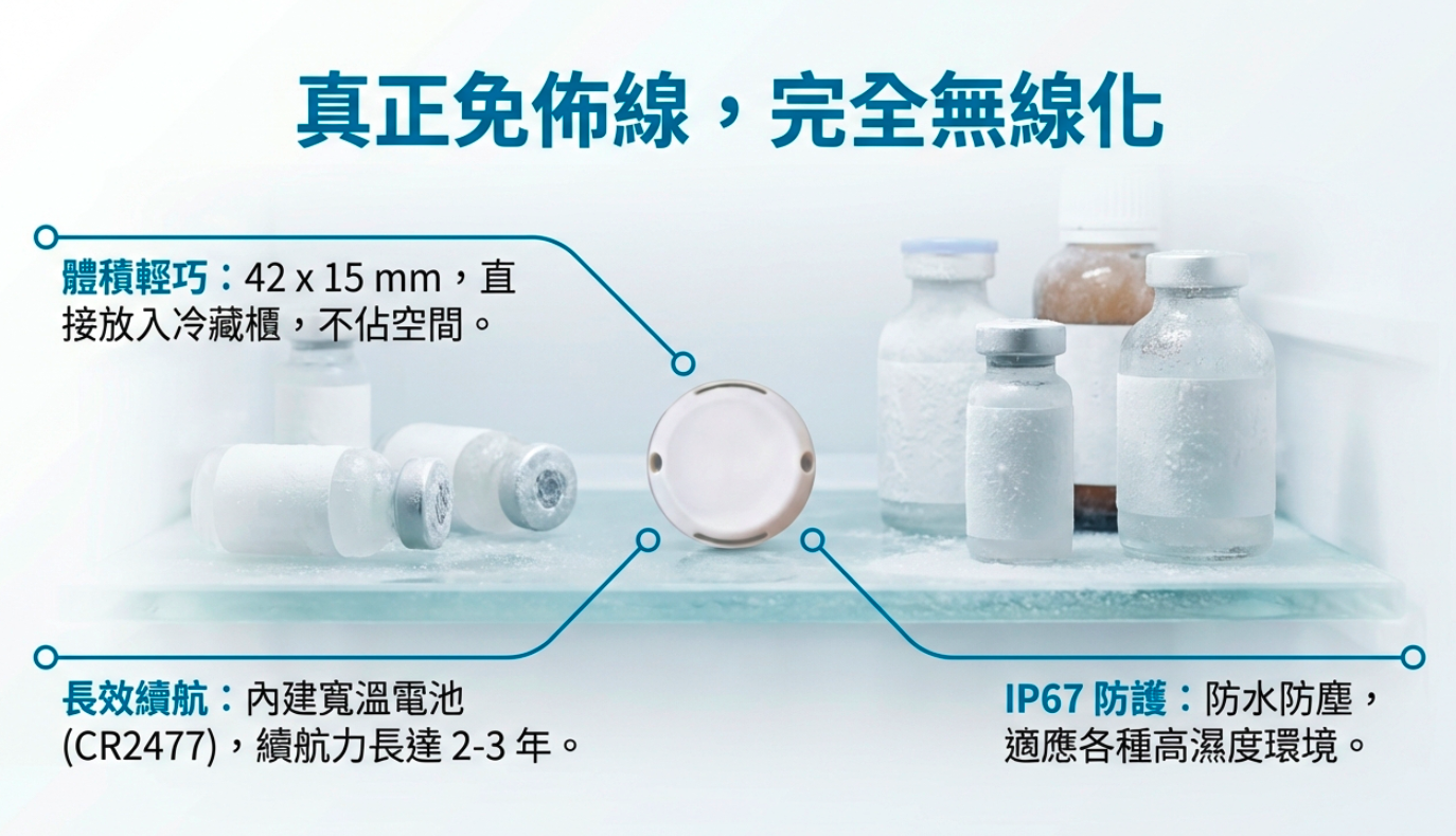 * 免佈線、免插電(Wireless & Battery-powered): 體積輕巧,直接放入冷藏櫃或恆溫箱即可運作,解決了傳統感測器需要穿孔引線導致冰箱氣密性受損的問題。