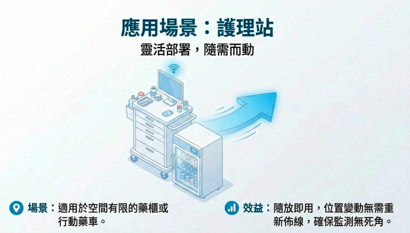 護理站的冰箱空間有限。RL303T 隨放即用的特性,讓醫護人員能隨時彈性調整監測位置,數據自動透過 WiSUN 網狀網路 回傳,不受室內隔間阻擋。