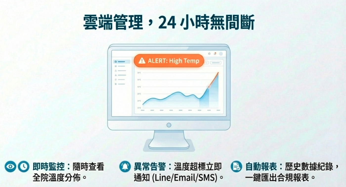 24 小時紀錄、自動產出報表、異常告警推送。 |