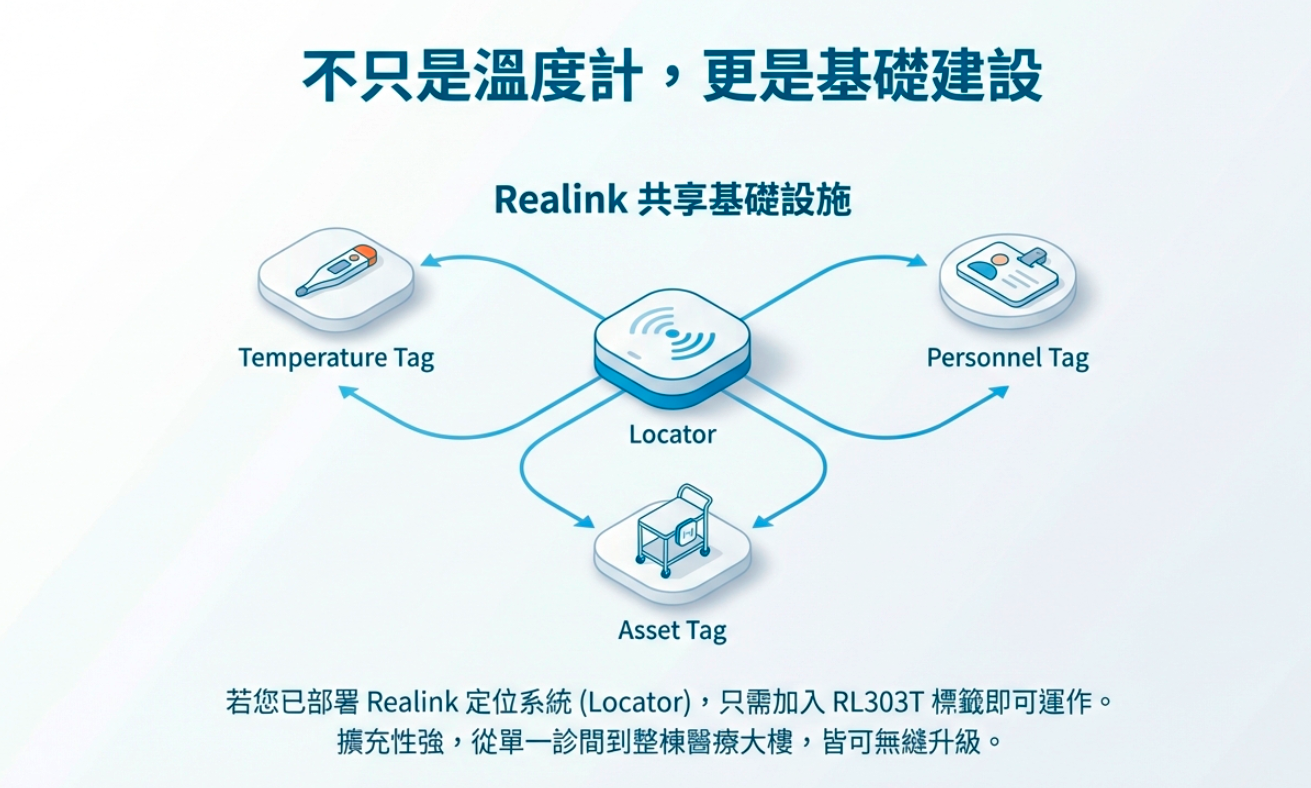 Realink 推出專為醫療環境設計的 RL303T 藍牙溫度監測標籤,結合 BLE-WiSUN Locator 定位系統,讓醫院在無需額外插電、無需拉網路線的情況下,實現自動化、高精度的環境監控。