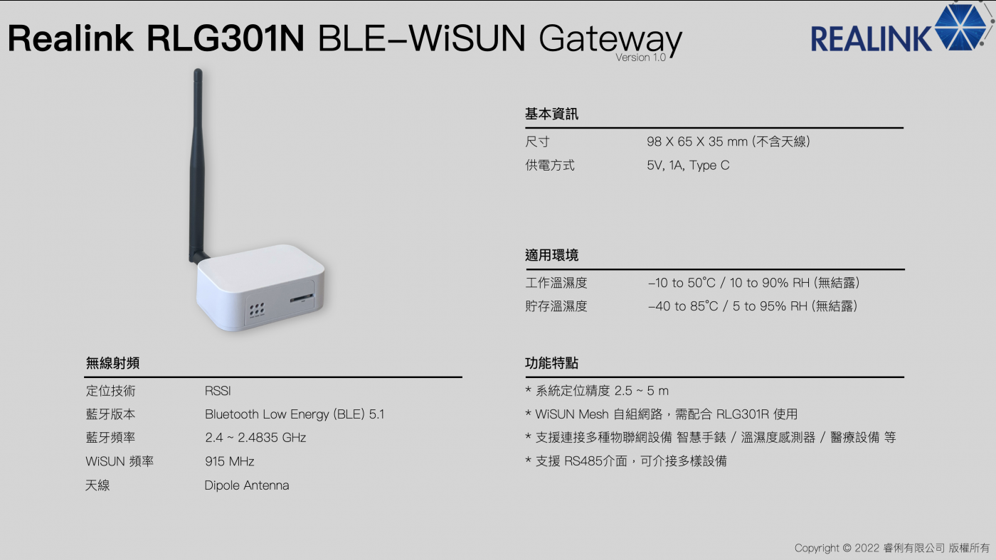 ◆RLG301R BLE-WiSUN Locator/Gateway 是本系統中相當於主機階層的產品,可以與相當於子機的 RLG301N 自動建立 WiSUN 連線。